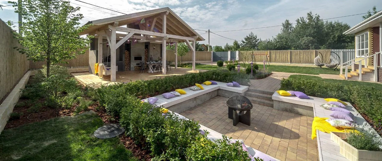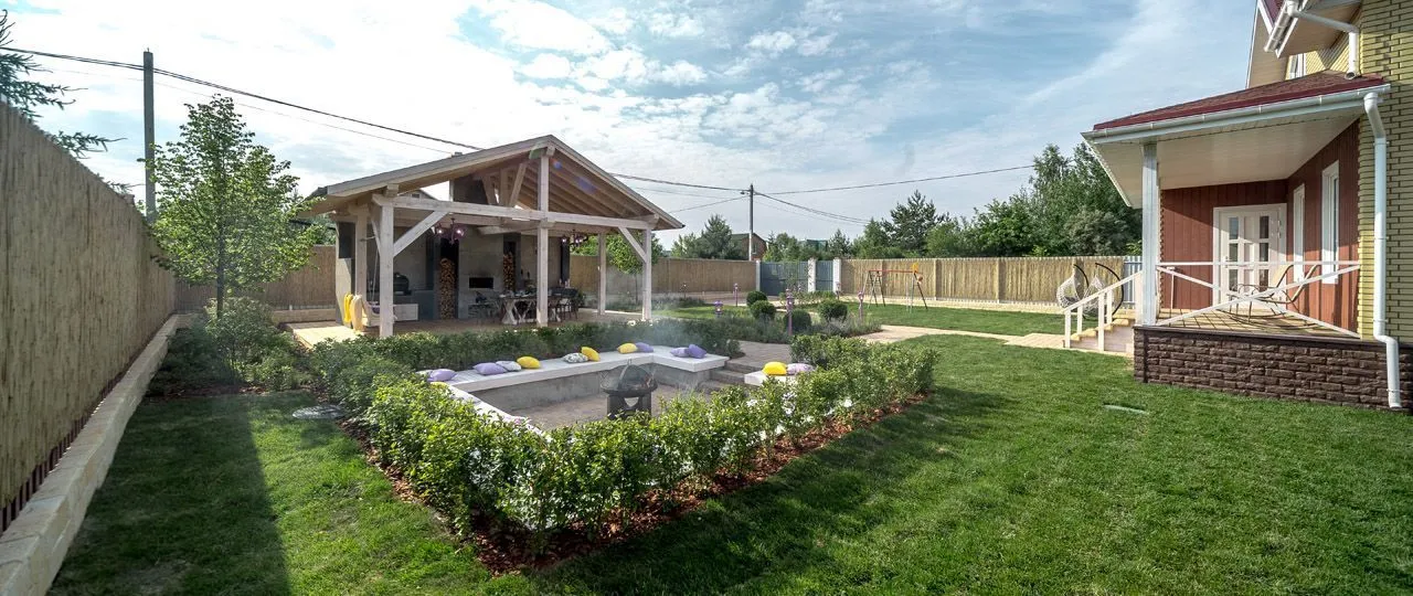 Помимо настроения, авторы концепции позаботились о функционале участка: вместительная беседка с мангальной зоной и полноценной кухней с просторными рабочими поверхностями для приготовления плова.