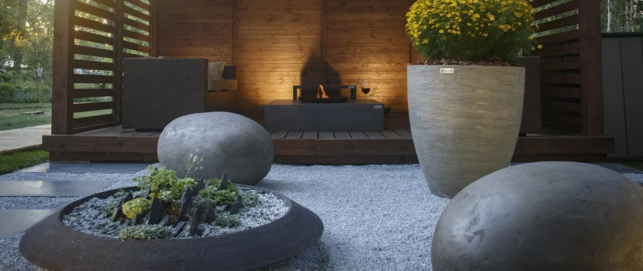 Помимо двухуровневой террасы, мы показали большие кашпо формата XXL, а также наше плоское кашпо с альпинарием. Альпинарий интересен тем, что не требует вообще какого-либо ухода. Растения в нем не прихотливы в уходе, не требуют полива и не боятся прямых солнечных лучей.