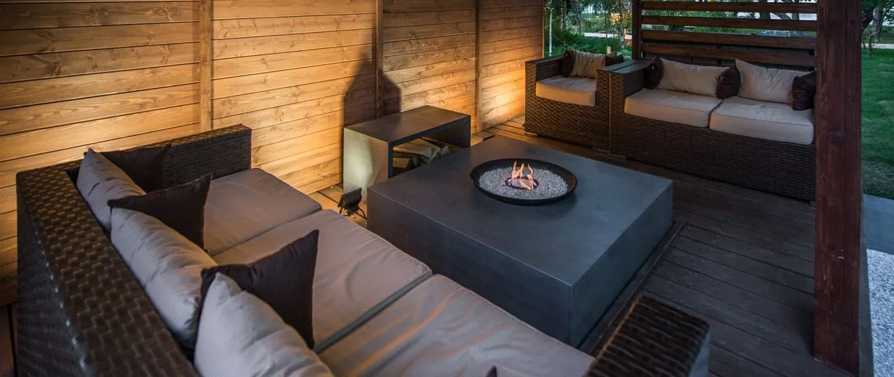 Мы представили двухуровневую террасу, на первом этаже которой находится зона с биокамином, столиком-дровницей и мягкими диванами, где можно собираться в любую погоду, а на верхнем – место для приема солнечных ванн.