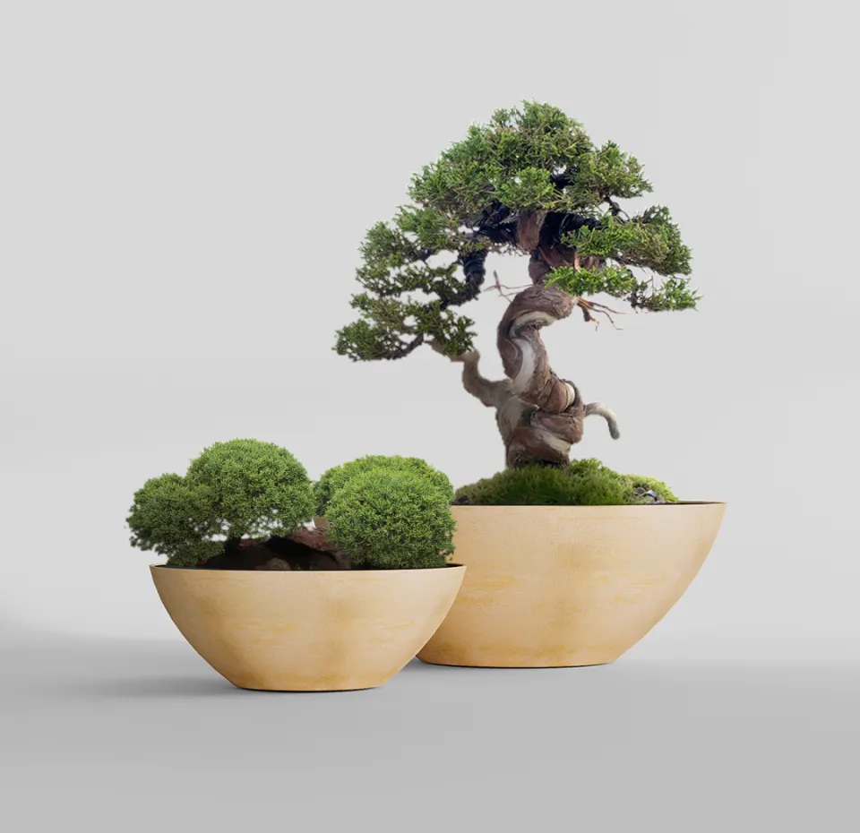 Форма отсылает к многовековому японскому исскуству выращивания миниатюрных деревьев – бонсай. Кашпо этого вида обычно низкие, неглубокие и широкие, с изогнутыми краями, которые только подчеркивают природную форму такой чаши. В таком кашпо хорошо удерживается почва, влага, но при этом обеспечивается хорошая аэрация корней. Форма Бонсай создает сбалансированную и стабильную среду для роста и развития растения, обеспечивает корням широкое, достаточное для развития пространство.