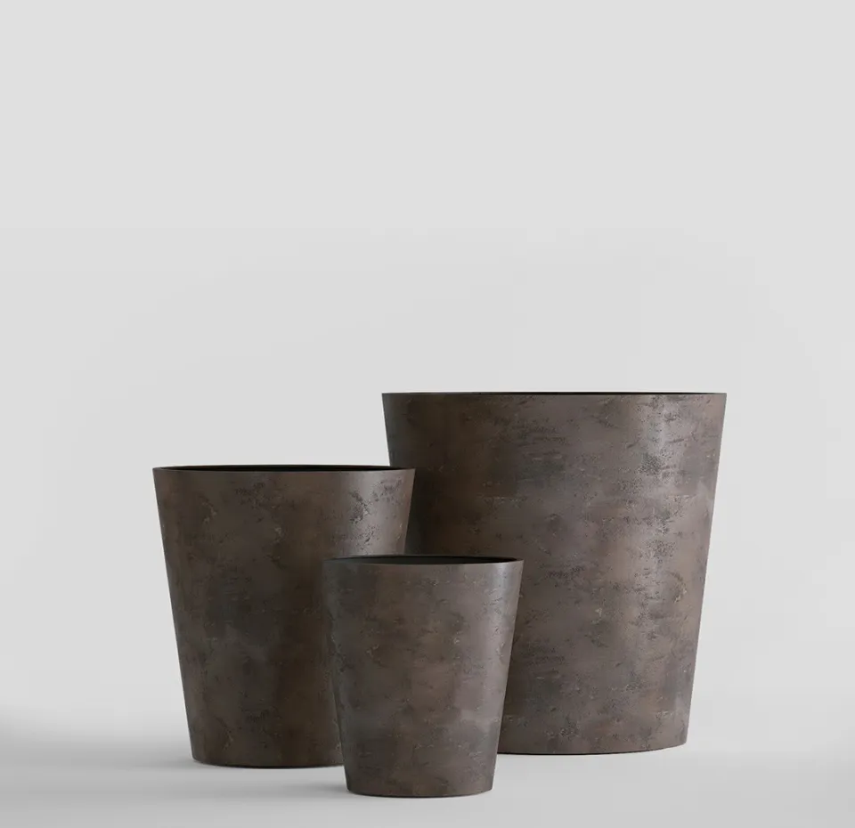 Круглая воронка расширяется вверх, как будто ее только что поразила природная стихия. Четкие линии и уверенный силуэт делают эту форму кашпо универсальной для использования и на открытом воздухе, и внутри помещений.