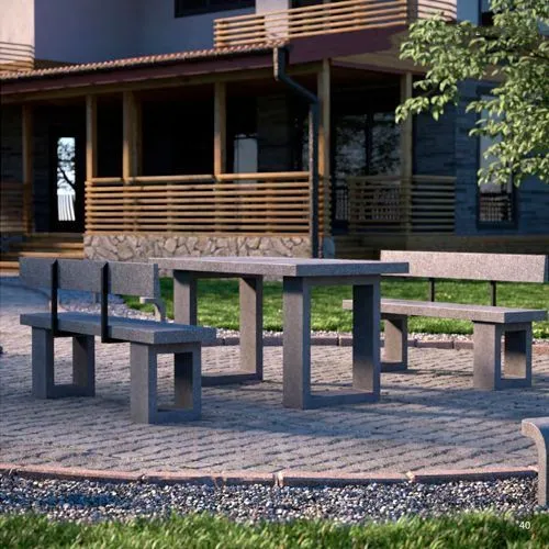 Мебель из фибробетона долговечна, благодаря возможности закрепления ножек скамеек и стола на горизонтальной поверхности приобретает дополнительную устойчивость.