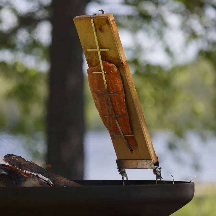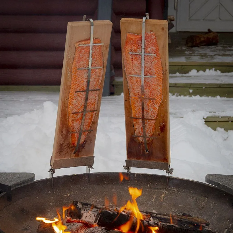 Доски для приготовления рыбы имеют специальные крепления для регулировки угла наклона по отношению к костровой чаше и, соответственно, температуры приготовления.